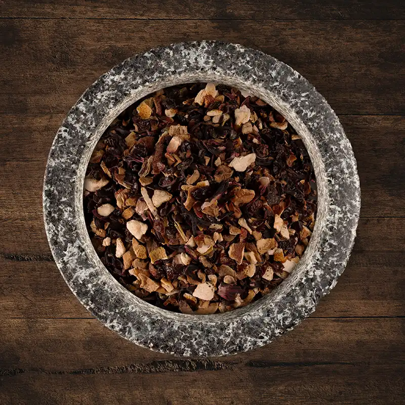 Zutaten: Hagebuttenschalen, Hibiskusblüten, Orangenschalen, Apfel, Zitronenschalen.